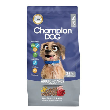 Alimento especialmente formulado para perros de edad avanzada (+7 años), que necesitan una dieta sin exceso de nutrientes, debido a un metabolismo menos exigente producto de su disminución en el nivel de actividad. Beneficios: OVO PROTEÍNA: Contiene aminoácidos esenciales para su desarrollo. CONTROL DE SARRO DENTAL: Ayudará a tu peludo a prevenir la acumulación de sarro en sus dientes, manteniendo su sonrisa en todo momento. CALCIO: Para cuidar bien sus huesos y dientes. OMEGA 3 Y 6: Mantendrán saludables su piel y pelaje. Estará listo para recibir cariño. PREBIÓTICOS: Le aportarán bacterias positivas para su cuerpo peludo. Ingredientes: Maíz y/o triticale y/o sorgo, afrechillo de trigo, harina de soya y/o gluten de maíz, harina de subproductos de aves (pollo y/o pavo), huevo, harina de pescado (salmón), hidrolizado de subproductos animales (pollo y/o cerdo), grasa animal (sebo bovino y/o grasa de cerdo y/o aceite de pollo preservado con BHA, BHT y etoxiquina), cloruro de sodio, aluminosilicatos, aceite de pescado (fuente de EPA y DHA), zanahoria y/o espinaca deshidratada, ácido propiónico, betaglucanos , extracto de quillay y/o yucca, hexametafosfato de sodio, taurina, mananoligosacaridos (fuente de fibra prebiótica), colorantes autorizados. Vitaminas: A, D, E, K3, C, tiamina, riboflavina, ácido pantoténico, niacina, piridoxina, ácido fólico, cianocobalamina, colina, biotina. Minerales: calcio, fósforo, potasio, hierro, cobre, zinc, selenio, manganeso, yodo.